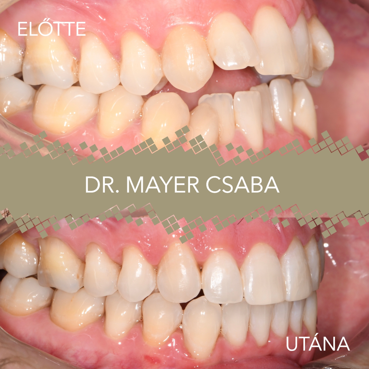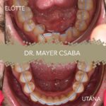 Hiszen ennél a páciensnél is látszik mekkora távolság van az alsó és a felső fogív között. Ha oldalról megnézzük látszik hogy a felső fogív szűkebben áll, mint az alsó, ezt keresztharapásnak hívjuk, mind a két oldalon. Az alsó fogívben hatalmas torlódás látható, látszik hogy az alsó szemfog 90 fokban van elfordulva, és amikor összezárja a páciens hátul a fogait akkor elől nem érnek össze, ezt nyitott harapásnak nevezzük.